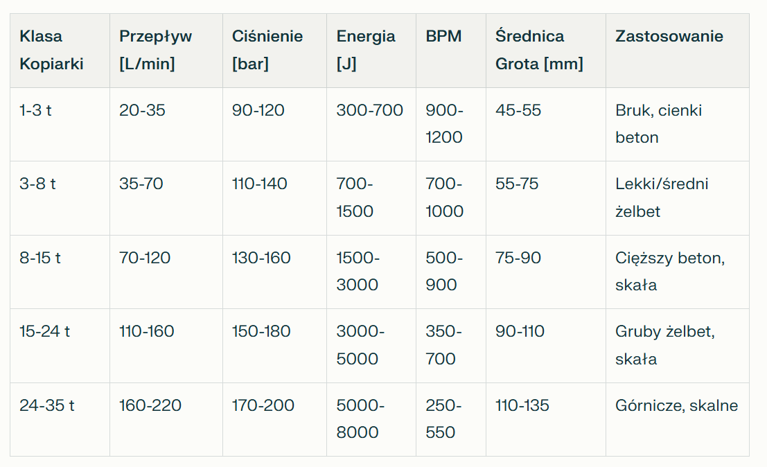 Należy porównać parametry hydrauliczne – przepływ oleju, ciśnienie i masę roboczą – z danymi technicznymi koparki. W razie wątpliwości najlepiej skonsultować wybór z producentem lub serwisem sprzętu.